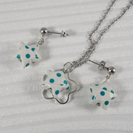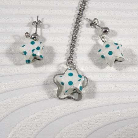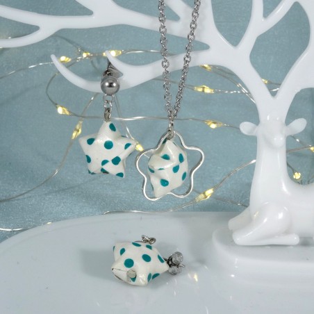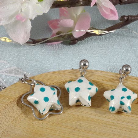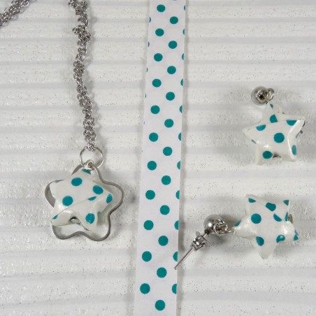 Cette parure Étoiles Origami est pliée à la main dans un papier blanc ponctué de pois verts, dont certains brillent une fois la lumière éteinte.