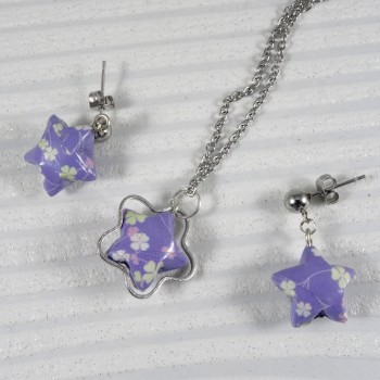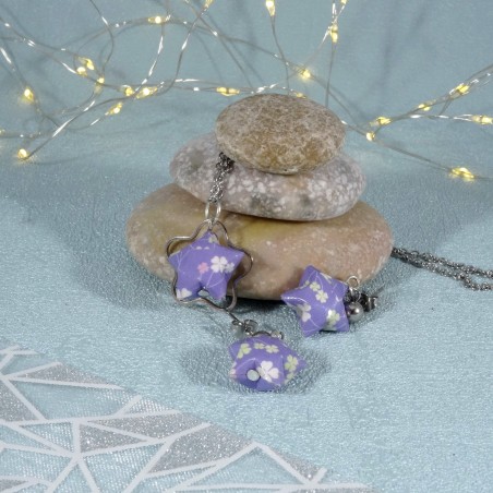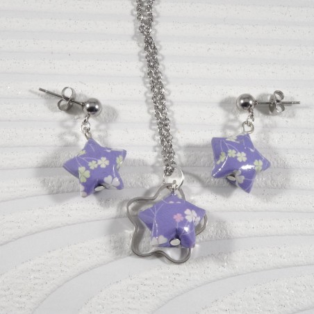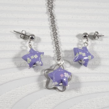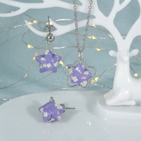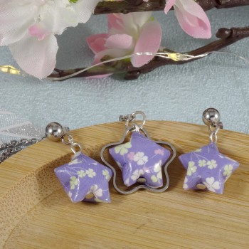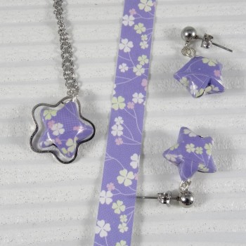 Cette parure Étoiles Origami est pliée à la main dans un papier parme délicat, orné de trèfles roses, blancs et jaunes pâles.