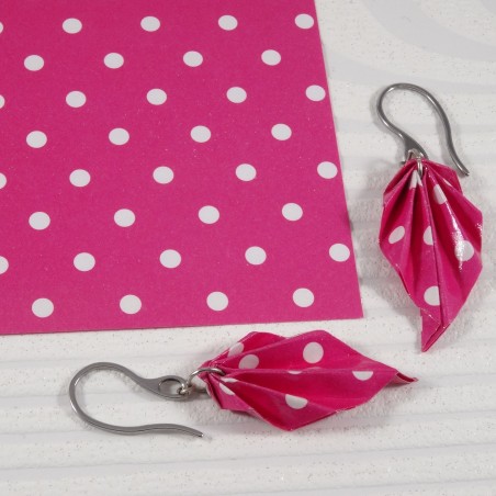 Chaque feuille est constituée d'un papier plié avec minutie à plusieurs reprises. Le papier utilisé est imprimé de gros pois blancs sur un fond rose fuchsia. Chacune des feuilles a été vernie pour lui apporter robustesse et brillance.