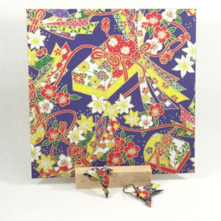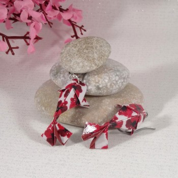 Plongez dans l’élégance du Japon avec cette paire unique de boucles d'oreilles Oiseaux en Origami. Réalisées à la main avec un papier bleu foncé orné de fleurs rouges et blanches aux contours dorés, ces boucles évoquent à la fois la délicatesse de l'artisanat japonais et l'élégance intemporelle. Chaque pli est soigneusement fait, garantissant que chaque oiseau est une création unique, née de l'authenticité de l'art fait main.