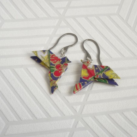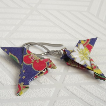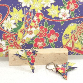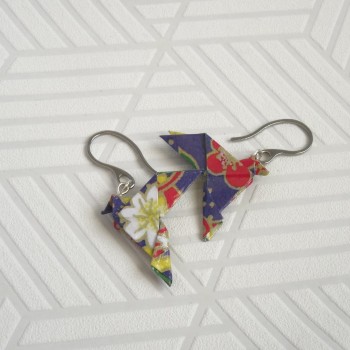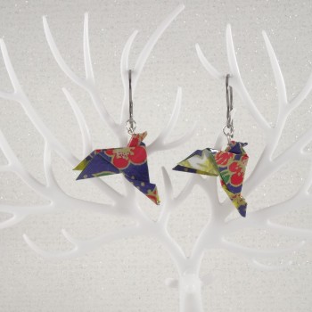 Plongez dans l’élégance du Japon avec cette paire unique de boucles d'oreilles Oiseaux en Origami. Réalisées à la main avec un papier bleu outremer orné de fleurs rouges et blanches aux contours dorés, ces...