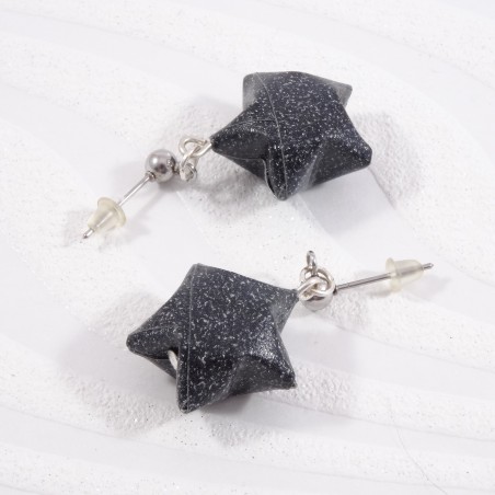 Ces boucles d’oreilles étoile en origami sont réalisées à la main dans un papier cadeau pailleté noir.