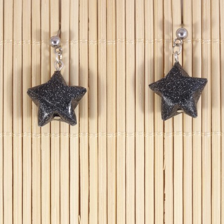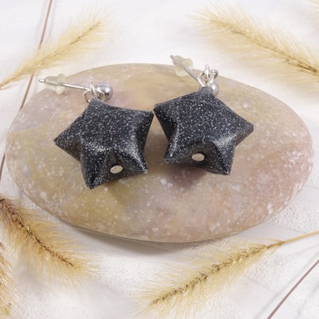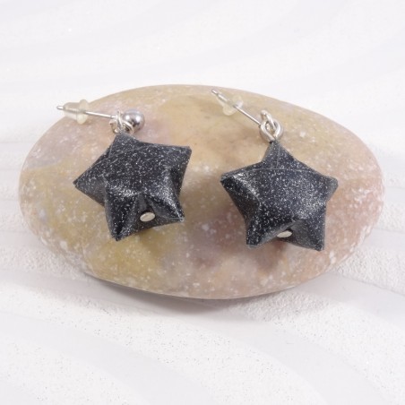 Ces boucles d’oreilles étoile en origami sont réalisées à la main dans un papier cadeau pailleté noir.