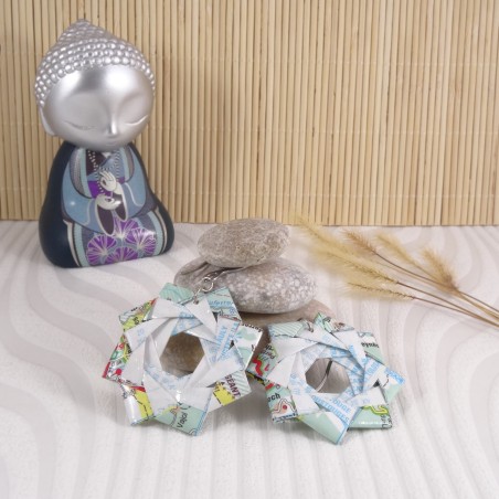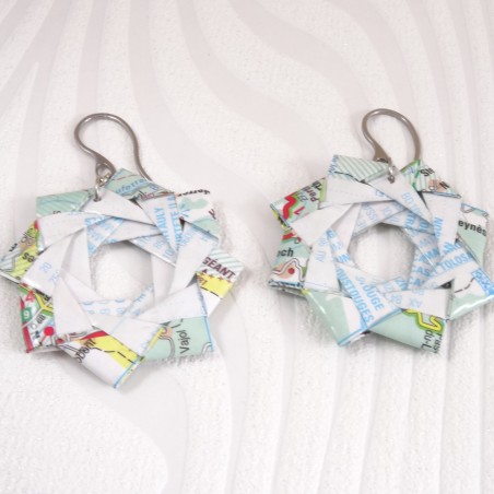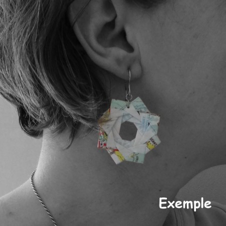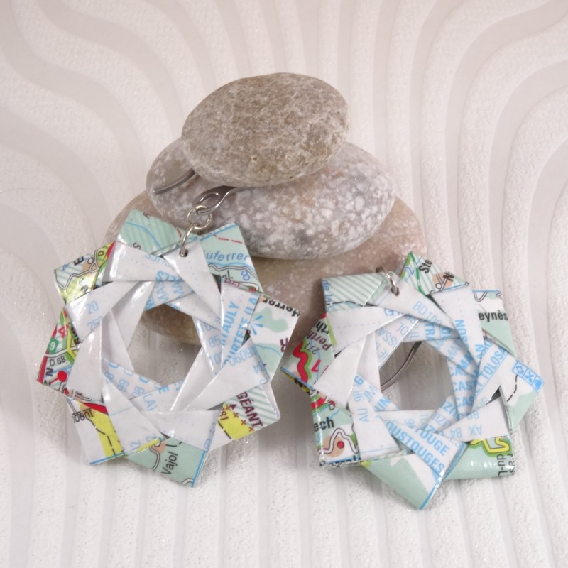 Ces boucles d'oreilles Rosace, faites main en origami à partir d'une carte routière des Midi-Pyrénées, allient art japonais et symbolisme. Inspirées du cercle parfait de l'ensō, elles incarnent l’harmonie et guident ton chemin à travers chaque pli de papier. Un bijou unique qui te rappelle que chaque parcours est une aventure.