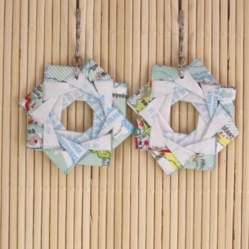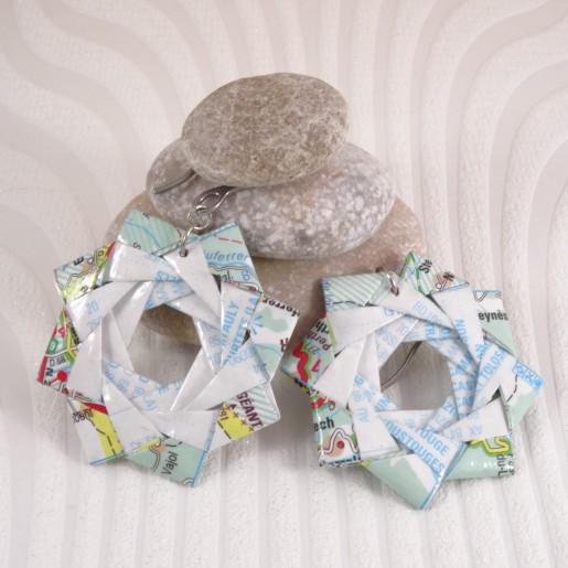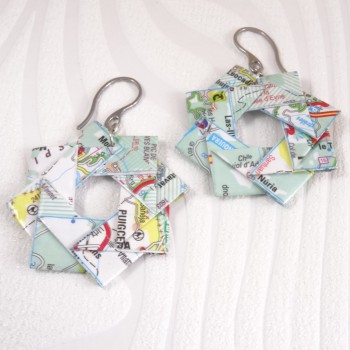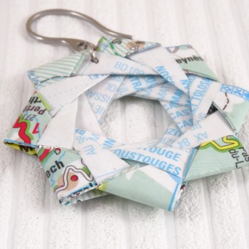 Chaque boucle d’oreille est soigneusement pliée à la main à partir de papier recyclé, une carte routière ancienne, pour un bijou respectueux de l’environnement et plein de caractère.