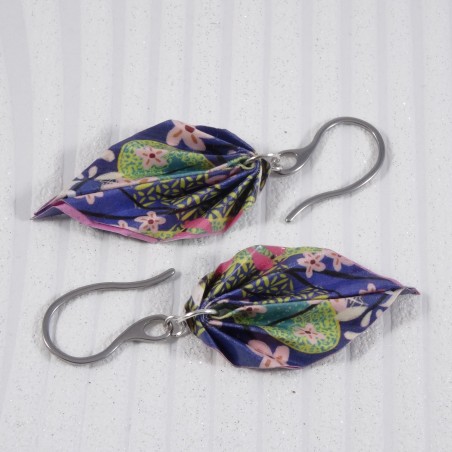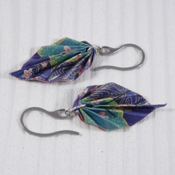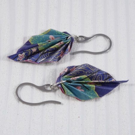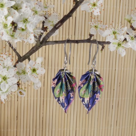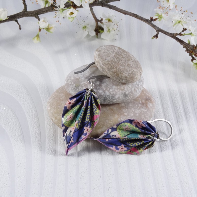 Boucles d’oreilles Origami Feuilles bleu foncé et sakura roses : un bijou léger et raffiné, inspiré de la tradition japonaise du hanami
