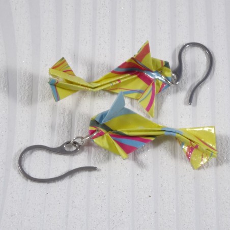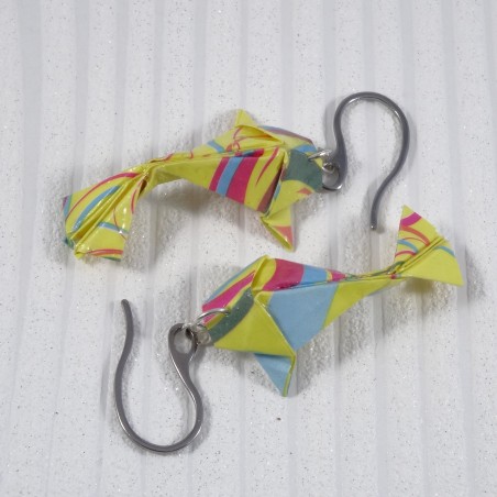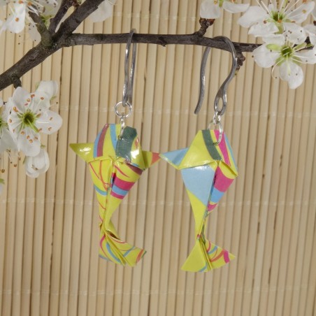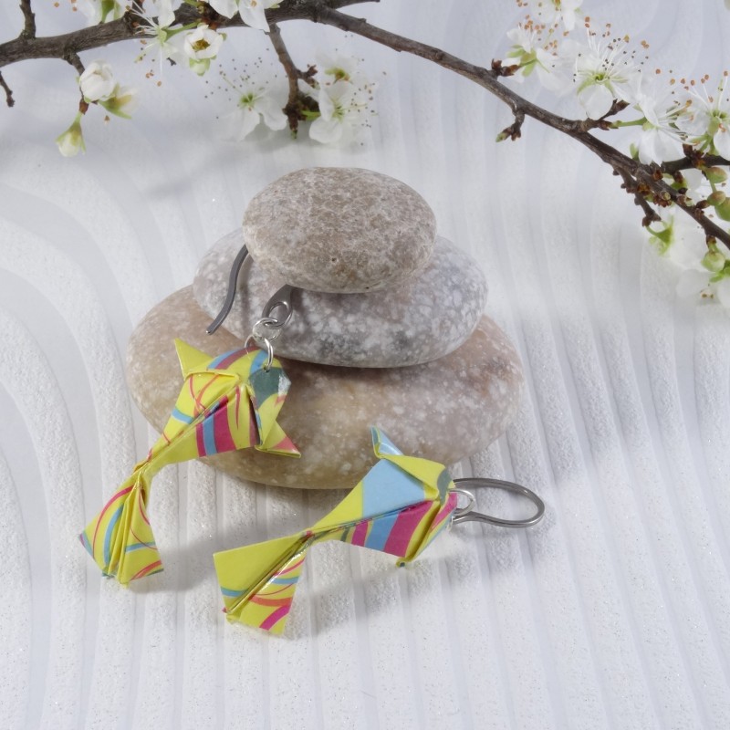 Boucles d'oreilles Origami Carpes Koï jaunes avec motifs géométriques roses et bleus, un bijou lumineux et symbolique, alliant tradition japonaise et design moderne.