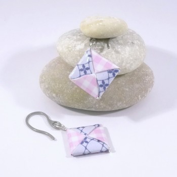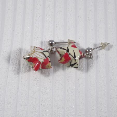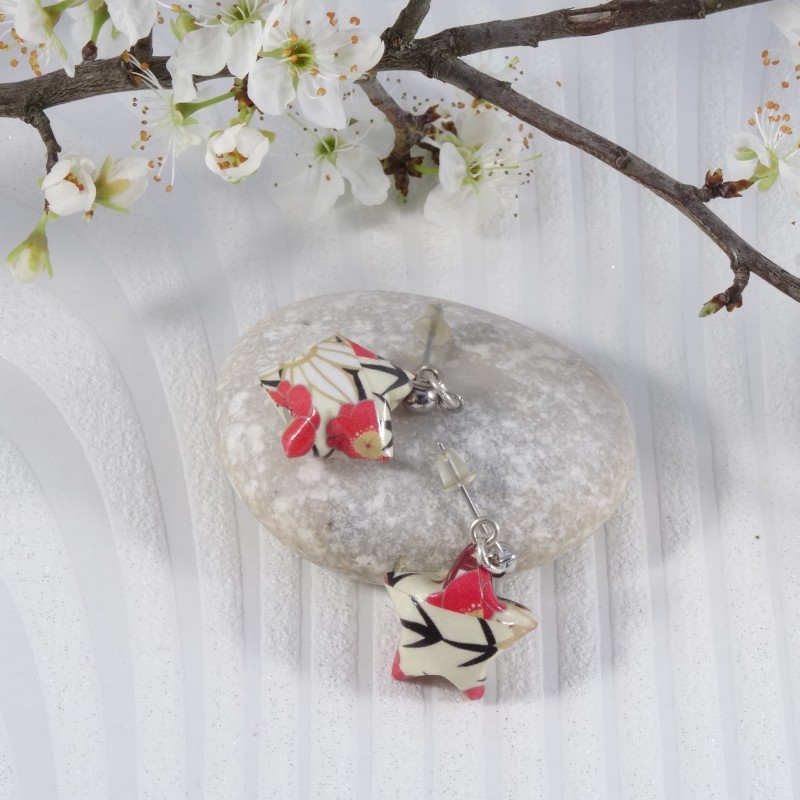 Un souffle de printemps japonais ! Ces boucles d’oreilles étoiles en origami, ornées de fleurs de cerisier sur fond blanc cassé, sont une ode à la délicatesse et à l’élégance.