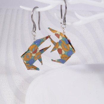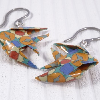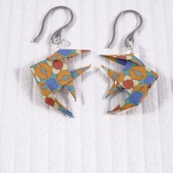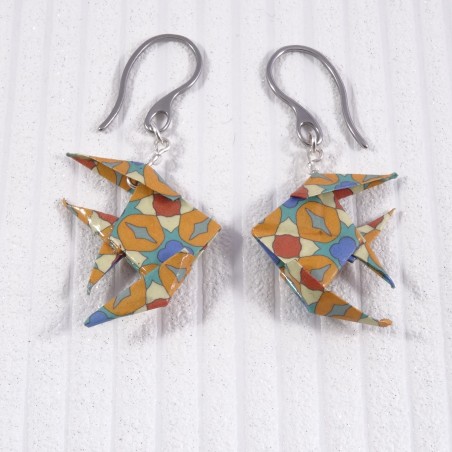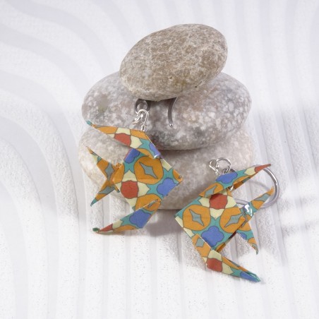 Boucles d’oreilles Poissons Origami aux motifs stylisés oranges, bleus et beiges, pour un look chaleureux, créatif et inspiré par le Japon.