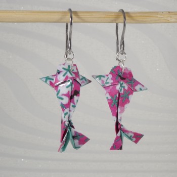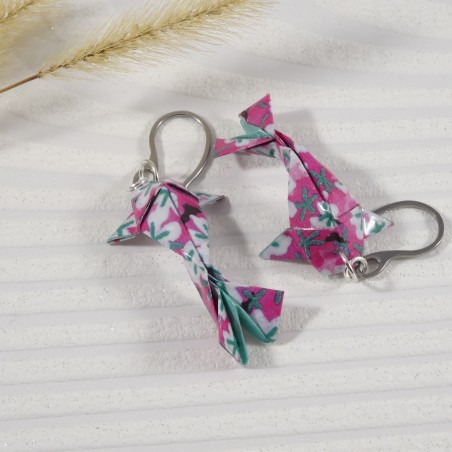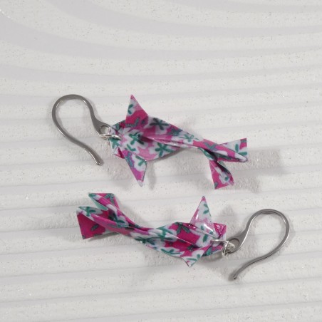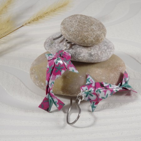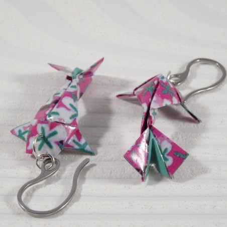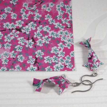 Ose l’audace poétique avec ces boucles carpes koï en origami : sakura bleu-vert et blanc sur fond fuchsia, un bijou fort et fleuri.