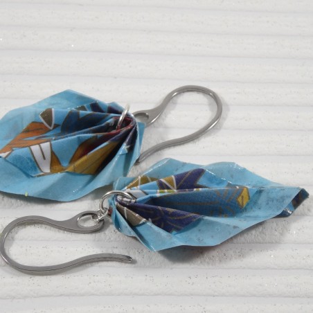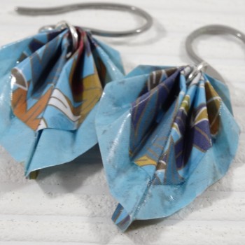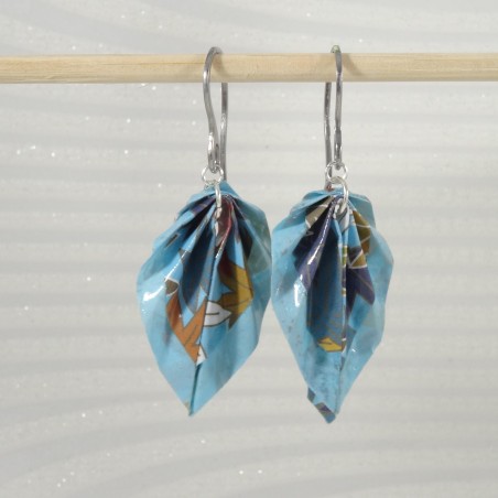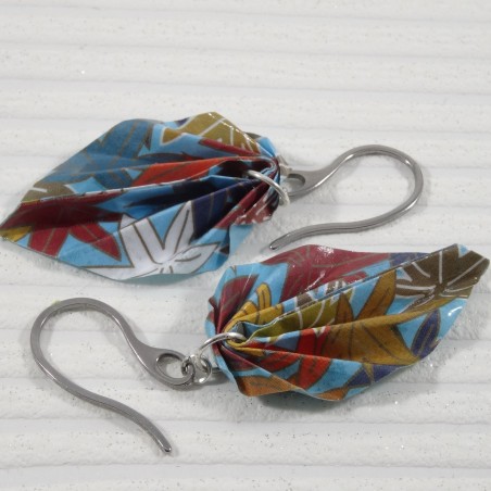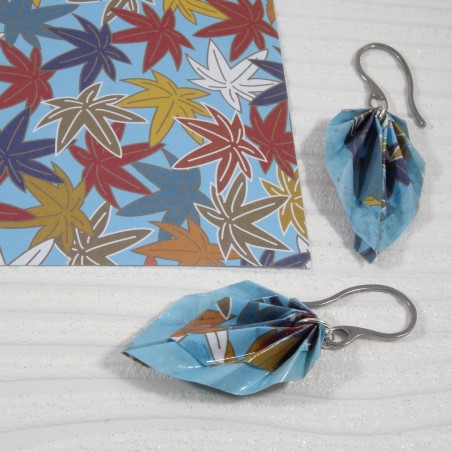 Ces boucles Feuilles en origami, pliées dans un papier imprimé de feuilles d’érable rouges, brunes et bleues, sont un hommage vibrant aux saisons qui changent et aux émotions qui évoluent.