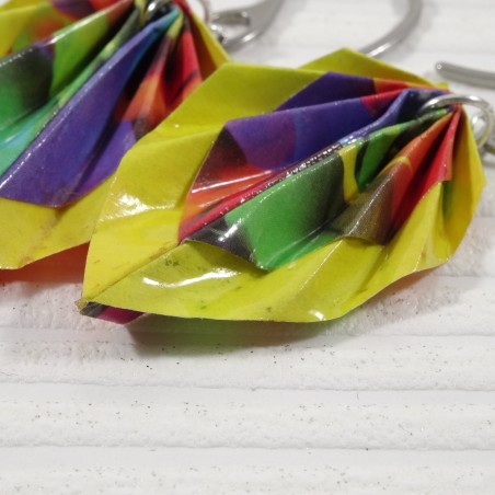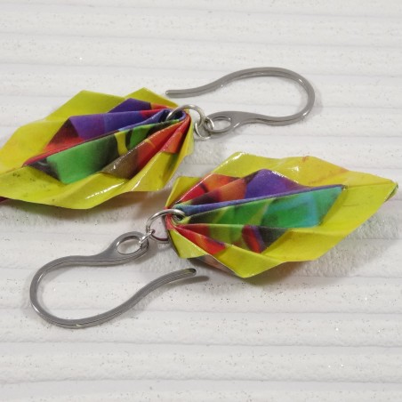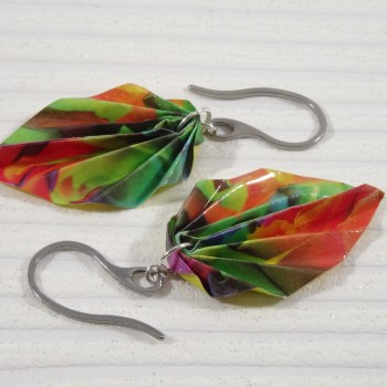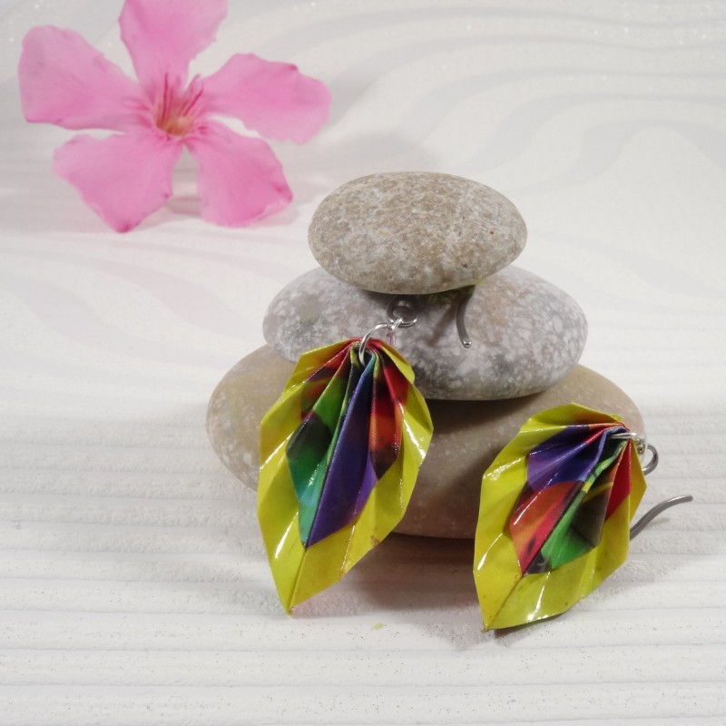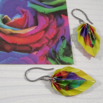 Des boucles Feuilles Origami aux roses multicolores et liseré jaune lumineux : un bijou qui mêle nature japonaise, symbolique florale et joie de vivre.