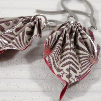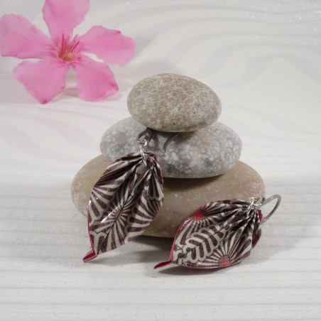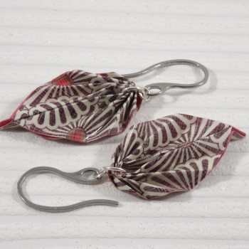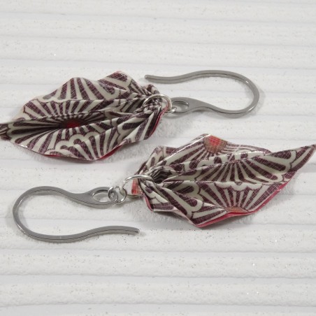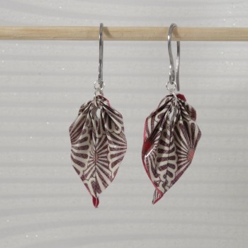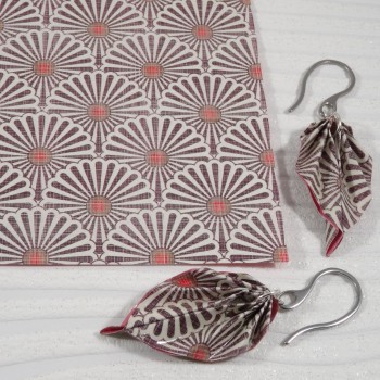 Ces boucles Feuilles en origami, pliées dans un papier aux tons naturels de marron et beige, sont imprimées de motifs floraux japonisants qui rappellent les marguerites stylisées qu’on retrouve dans les textiles traditionnels nippons.
