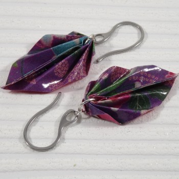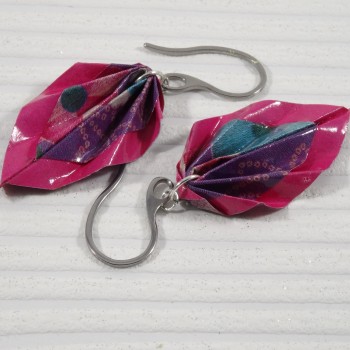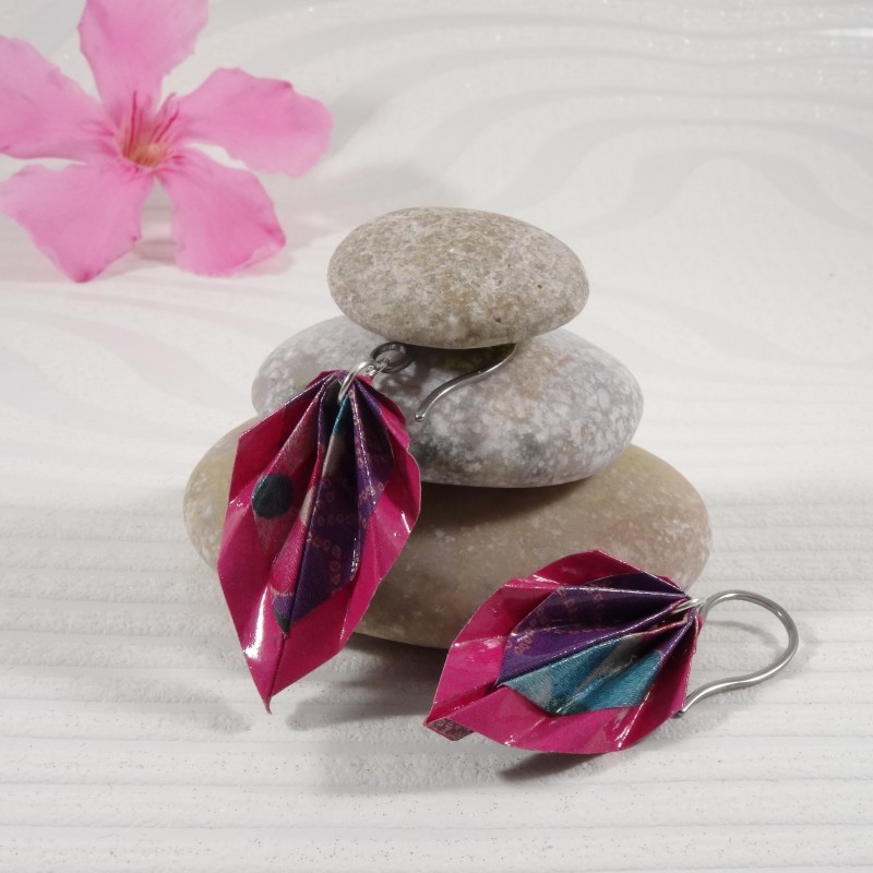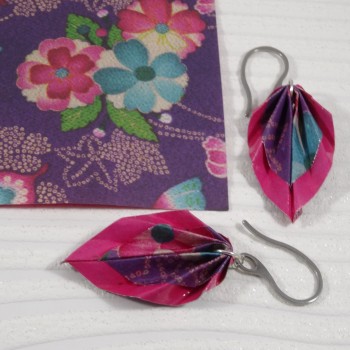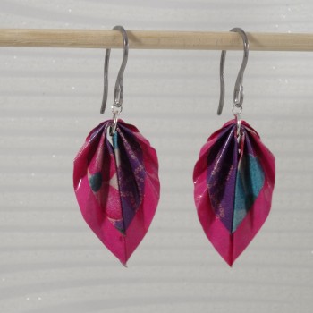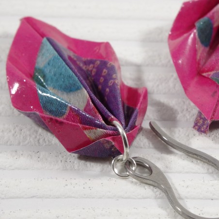 Des boucles en origami à liseré fuchsia et motif floral multicolore : un bijou éclatant, inspiré du printemps et des traditions japonaises.