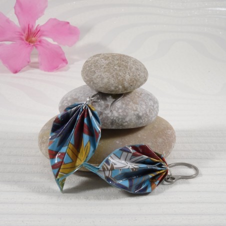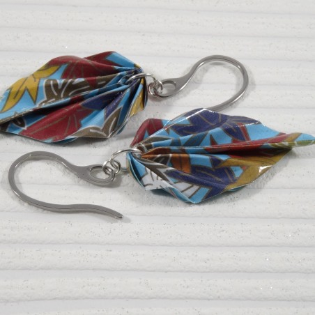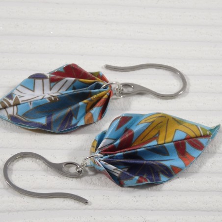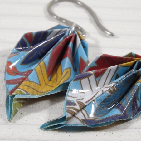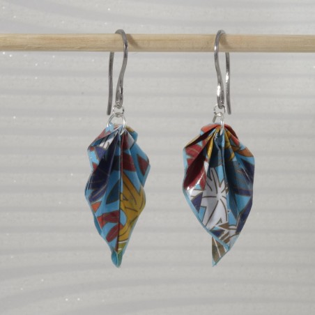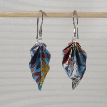 Ces boucles Feuilles en origami mêlent un bleu profond et apaisant à un motif de feuilles multicolores, aux teintes chaudes et douces. Chaque paire évoque la métamorphose des saisons, entre automne doré et renouveau printanier.