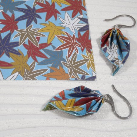 Des boucles Feuilles Origami avec motif feuillage multicolore sur fond bleu : un hommage délicat à la nature japonaise et à la beauté des saisons.