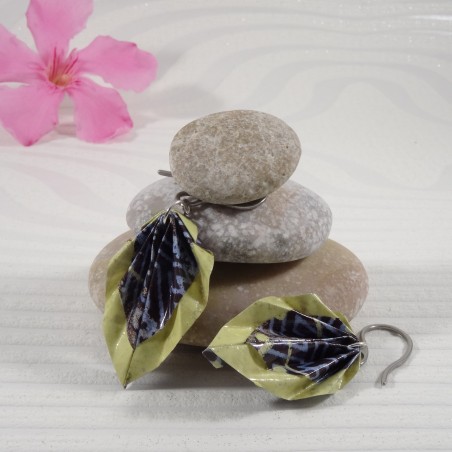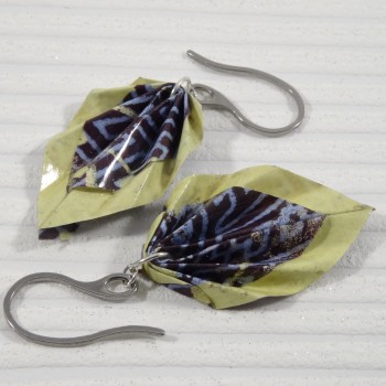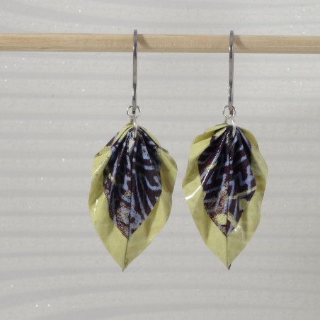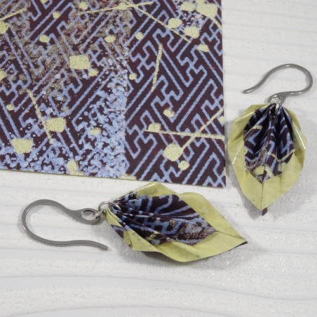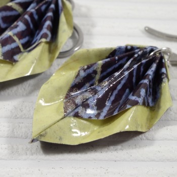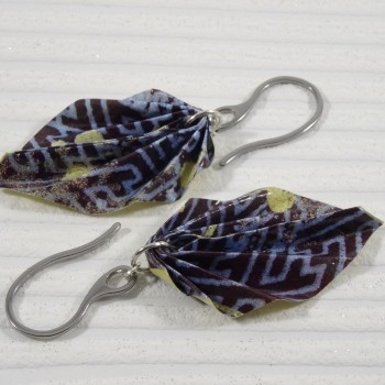 J’ai plié ces boucles Feuilles en origami dans un papier aux motifs géométriques bleus, que j’ai encadré d’un liseré jaune lumineux. Une rencontre entre rigueur graphique et joie solaire, comme une passerelle entre tradition japonaise et modernité.