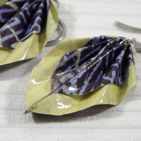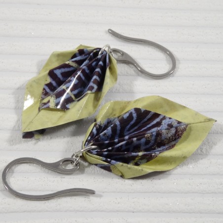 Boucles en origami avec motif géométrique bleu et liseré jaune lumineux : un bijou feuille à l’esprit japonais, entre structure et lumière.