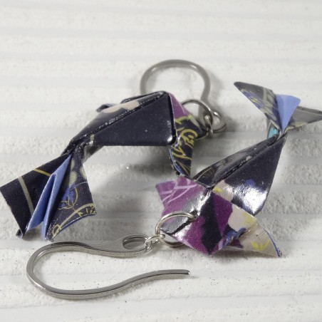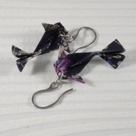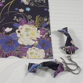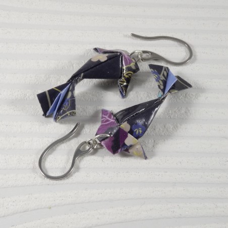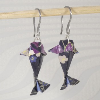 Laisse-toi envoûter par ces boucles d’oreilles Carpes Koï en origami, pliées dans un papier noir profond, rehaussé de fleurs violettes délicates.