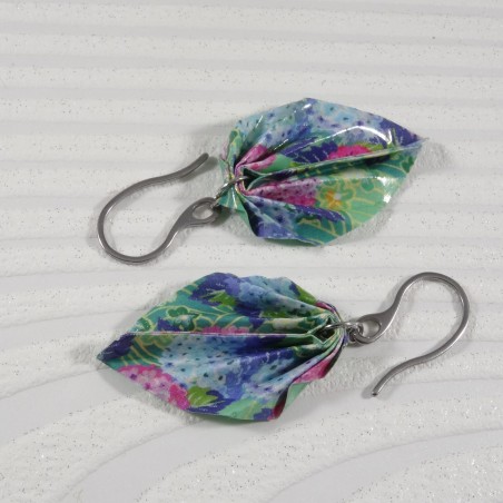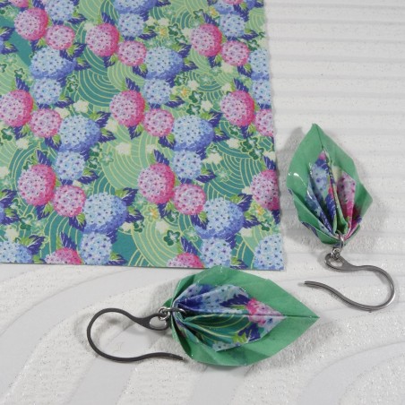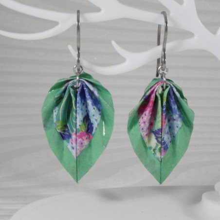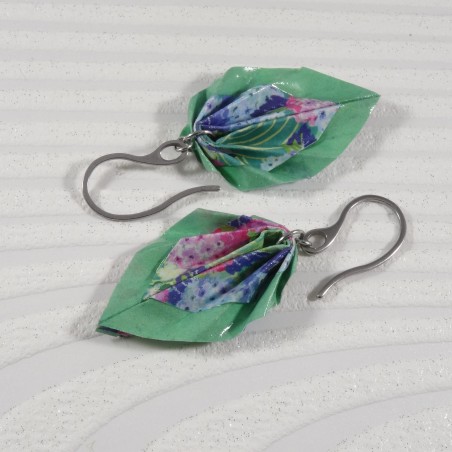 Ces boucles d’oreilles en origami sont façonnées dans un papier aux pivoines roses et violettes sur fond vert, avec un liseré vert délicat qui souligne chaque pli.