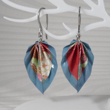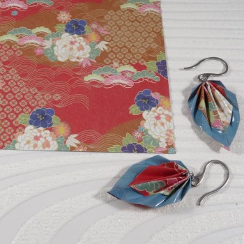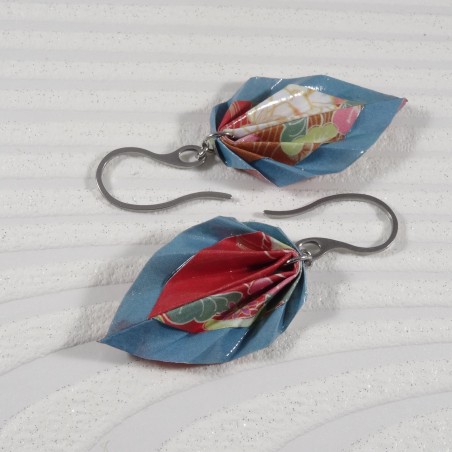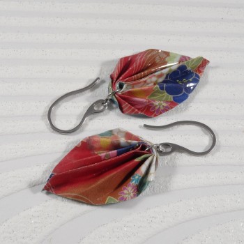 Ces boucles d’oreilles en origami sont réalisées dans un papier aux fleurs blanches et violettes sur fond rouge profond, rehaussé par un liseré bleu acier raffiné.