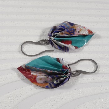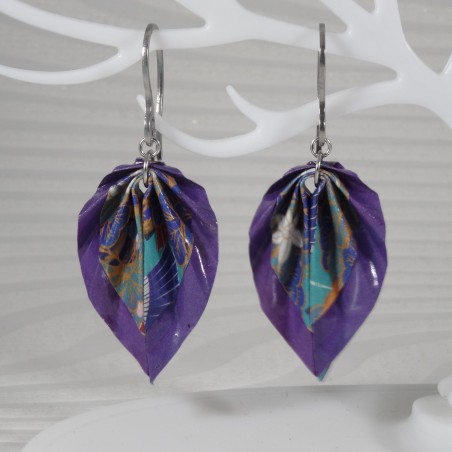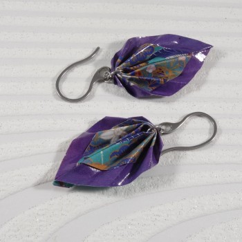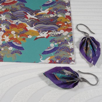 Ces boucles d’oreilles sont réalisées en origami avec un papier illustré de grues, ombrelles et arbres sur fond turquoise, souligné par un liseré violet.