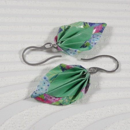 Ces boucles d’oreilles en forme de feuilles associent la délicatesse des pivoines roses et violettes sur fond vert à un liseré vert raffiné.