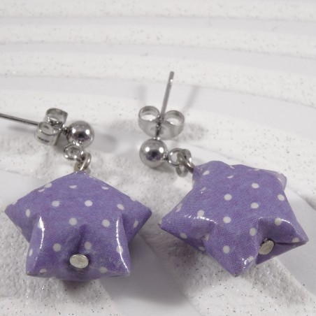 Ces boucles d’oreilles Étoile Origami révèlent un papier violet parsemé de pois blancs, plié avec délicatesse pour créer des étoiles légères et lumineuses.
