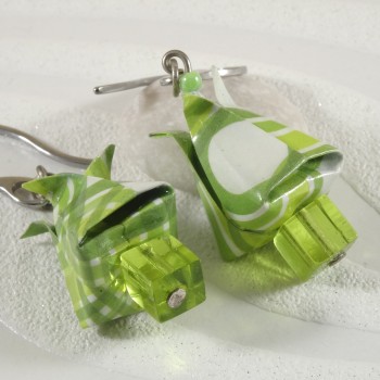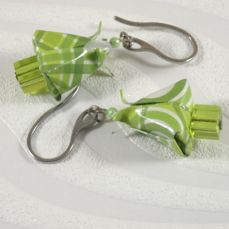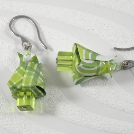 Ces boucles d’oreilles en papier plié, inspirées de la tulipe, t’apportent une touche unique et raffinée. Leur motif rayé vert et blanc sublime l’harmonie et l’énergie du printemps, pour un style qui allie symbolisme et modernité.