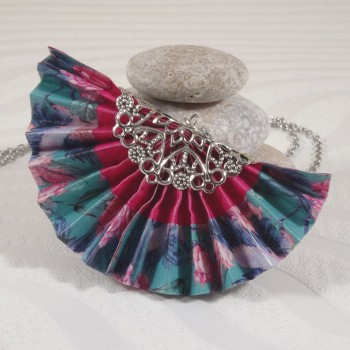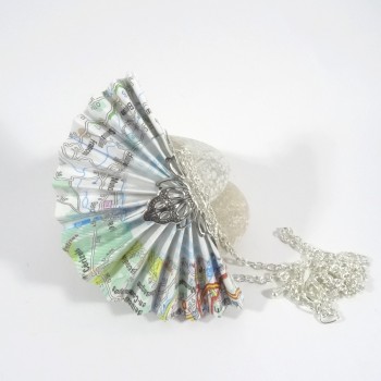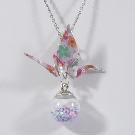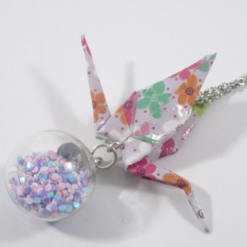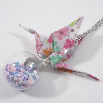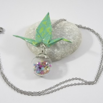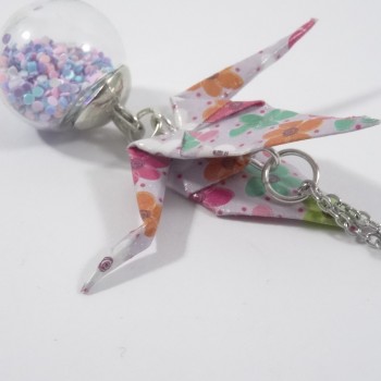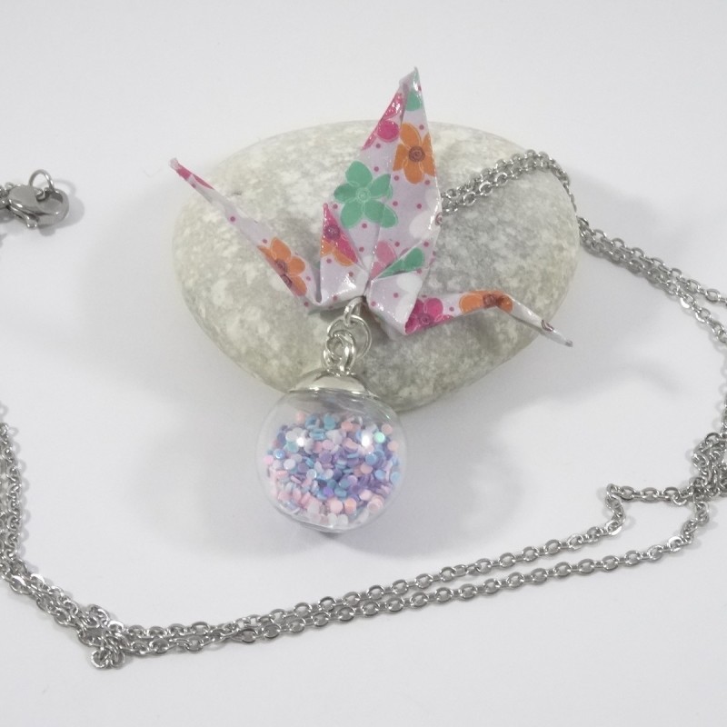 La dernière photo vous présente le modèle Collier Grue Origami sur Bulle porté.