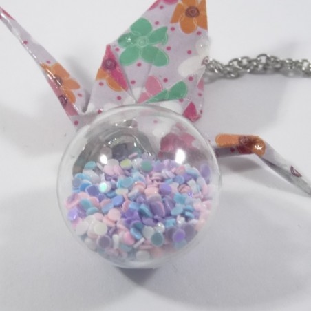 La grue est le symbole de la paix... Posée sur une bulle emplie de paillettes, elle sera du plus bel effet pour vos tenues de fin d'années.