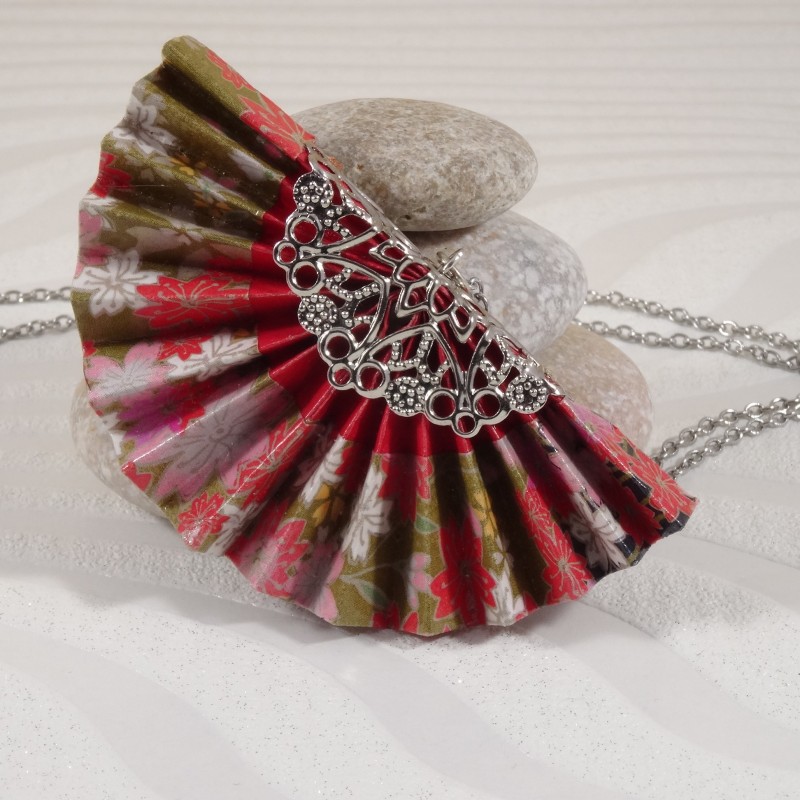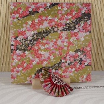 Ce collier délicat est un hommage à la beauté éphémère des cerisiers en fleurs. Son pendentif en forme d’éventail est entièrement plié à la main dans un papier raffiné, imprimé de sakura roses sur un fond noir et jaune or, avec un revers uni rouge intense. Une alliance parfaite entre tradition et modernité, pour un bijou empreint de poésie.