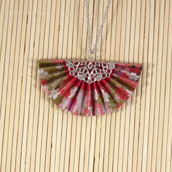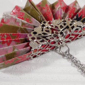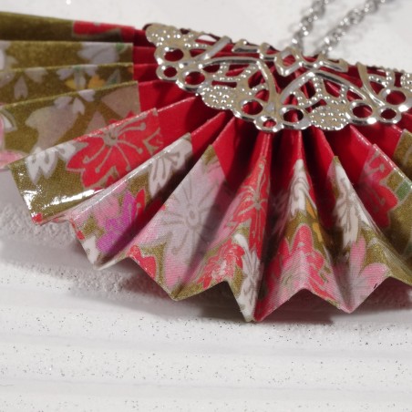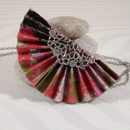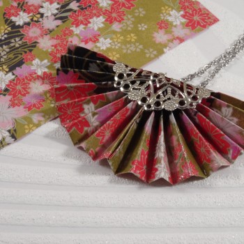 Laisse-toi charmer par ce collier éventail en origami, un bijou raffiné où les cerisiers en fleurs se déploient sur un fond noir et or, avec un élégant revers rouge uni.