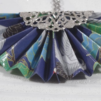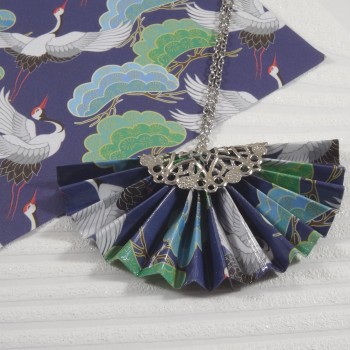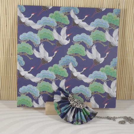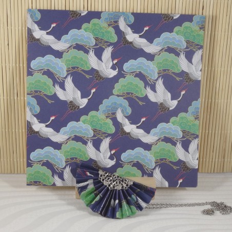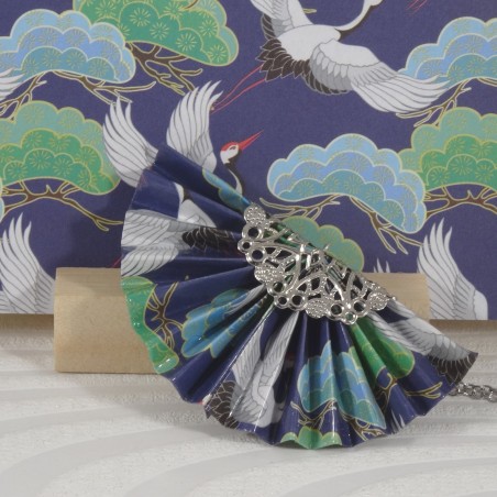 Le pendentif en forme d’éventail est réalisé avec un papier bleu foncé, sublimé par un motif de grues blanches et d’arbres stylisés. Une invitation à voyager dans la sérénité des paysages japonais.