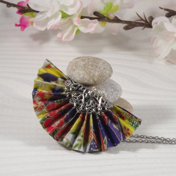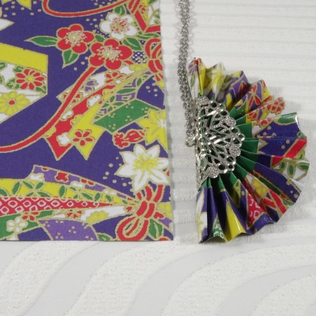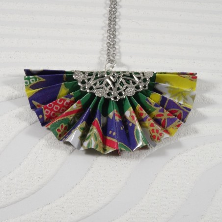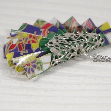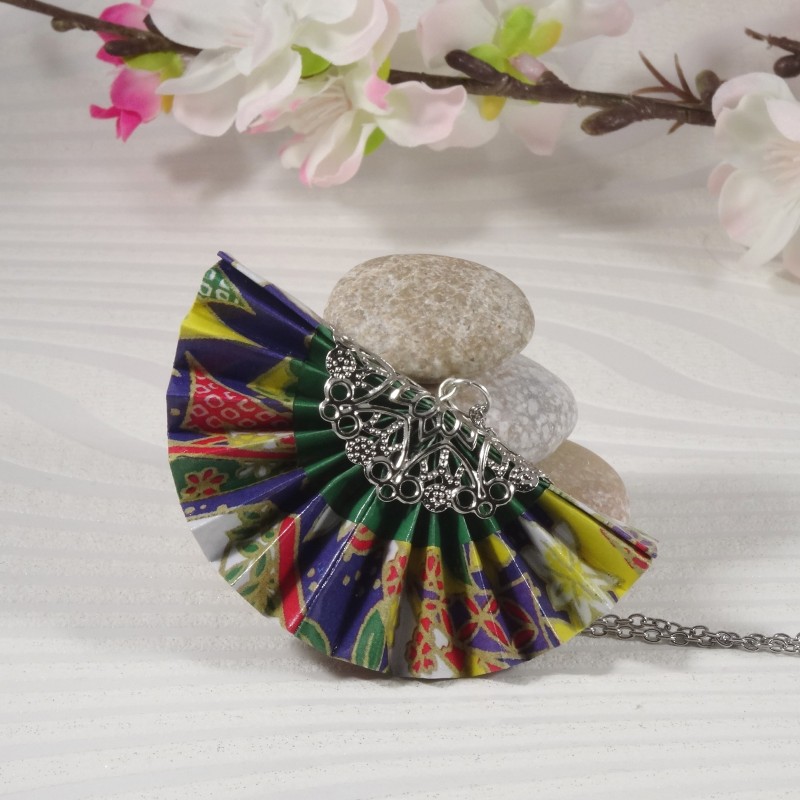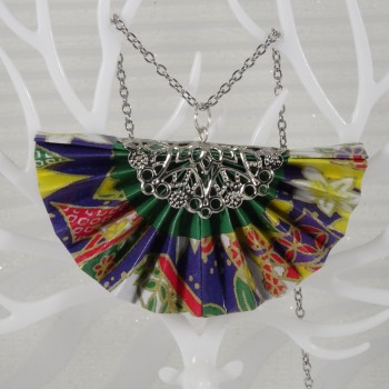 Laisse-toi charmer par ce collier Eventail en origami, plié à la main dans un papier vert délicat, sublimé par des motifs japonais colorés aux nuances de bleu, vert et jaune.
