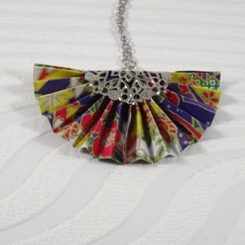 Un collier origami élégant où l’éventail vert s’illumine de motifs japonais bleus, verts et jaunes, pour une touche de raffinement et de poésie.