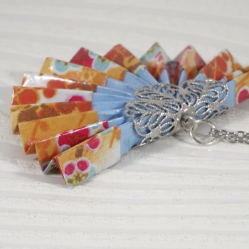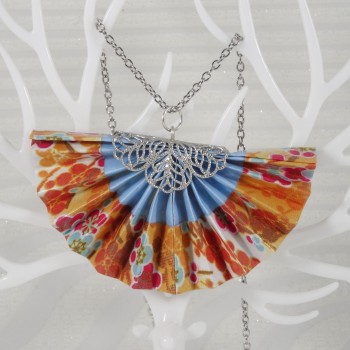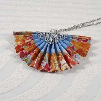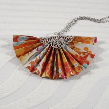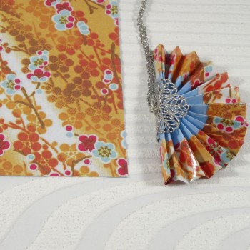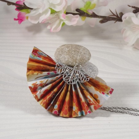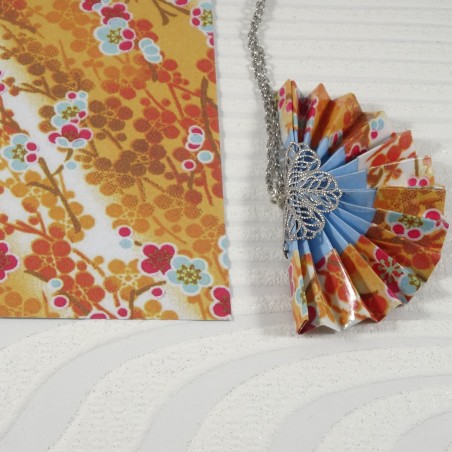 Un collier origami lumineux où l’éventail orange se pare de motifs floraux délicats, pour une touche de raffinement et de poésie japonaise.