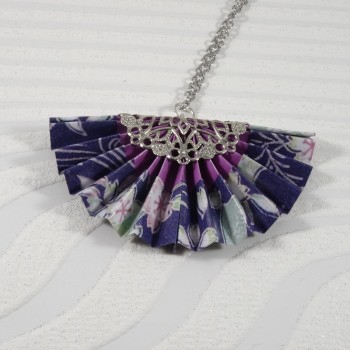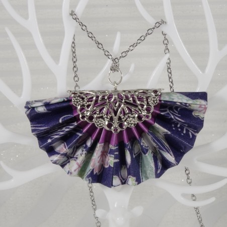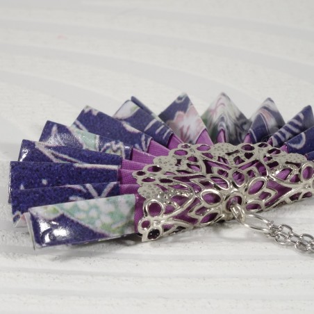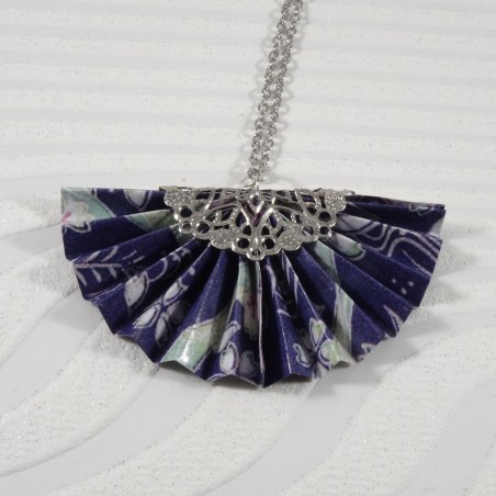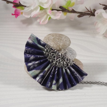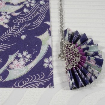 Ce collier Eventail Origami révèle un papier orné de sakura délicats sur fond bleu foncé, avec un coeur violet qui attire le regard.