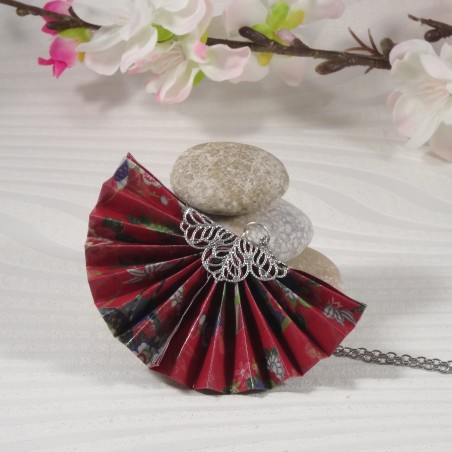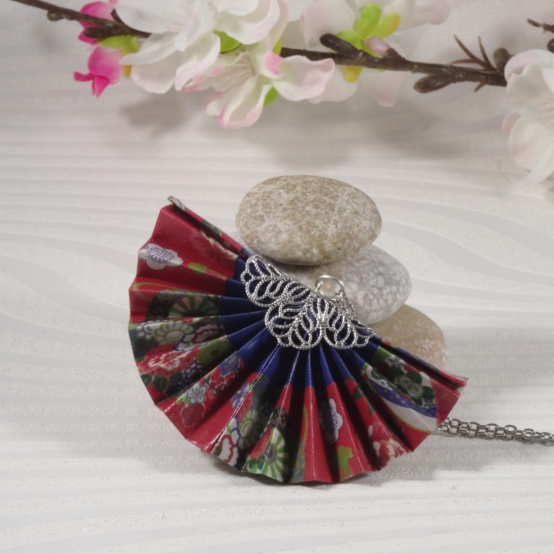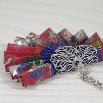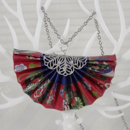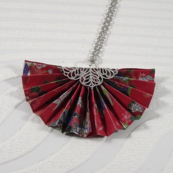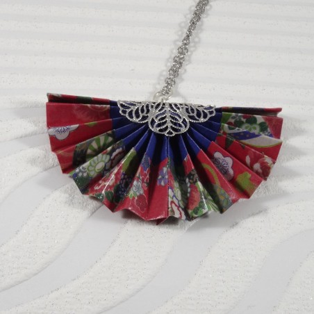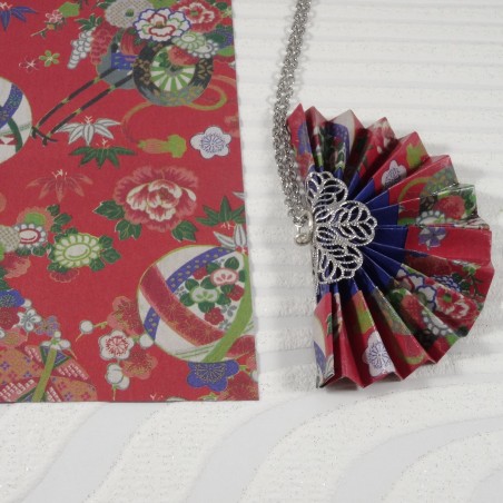 Ce collier Eventail Origami met en valeur un papier aux motifs floraux sur fond rouge intense, avec un coeur bleu foncé qui souligne la finesse du pliage.