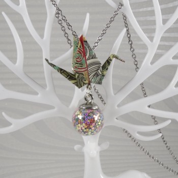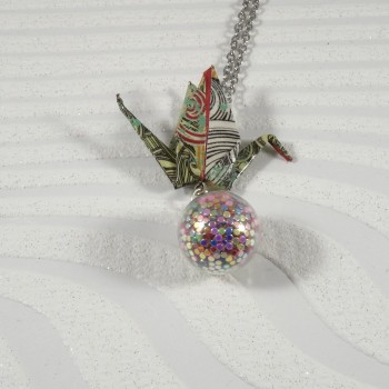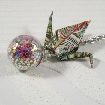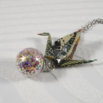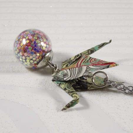Ce collier Grue Origami dévoile une grue délicate posée sur une bulle ornée de motifs circulaires noirs et beiges.