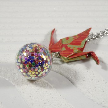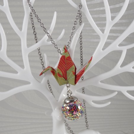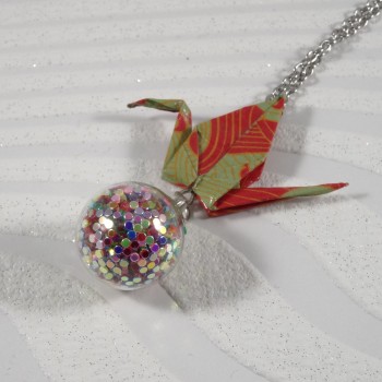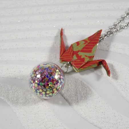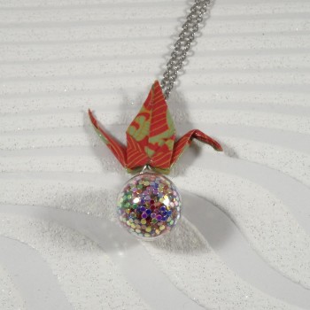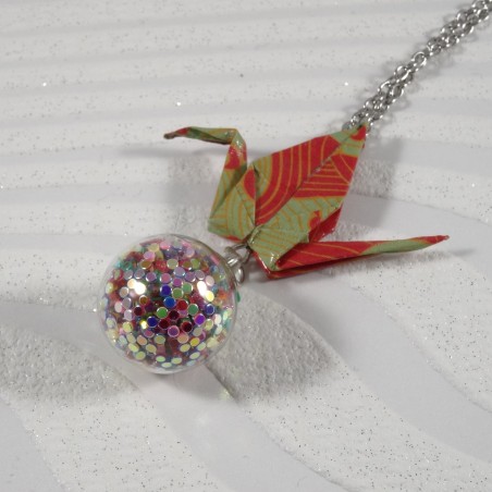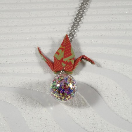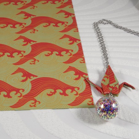 Ce collier Grue Origami met en scène une grue délicate posée sur une bulle aux vagues rouges et vertes.