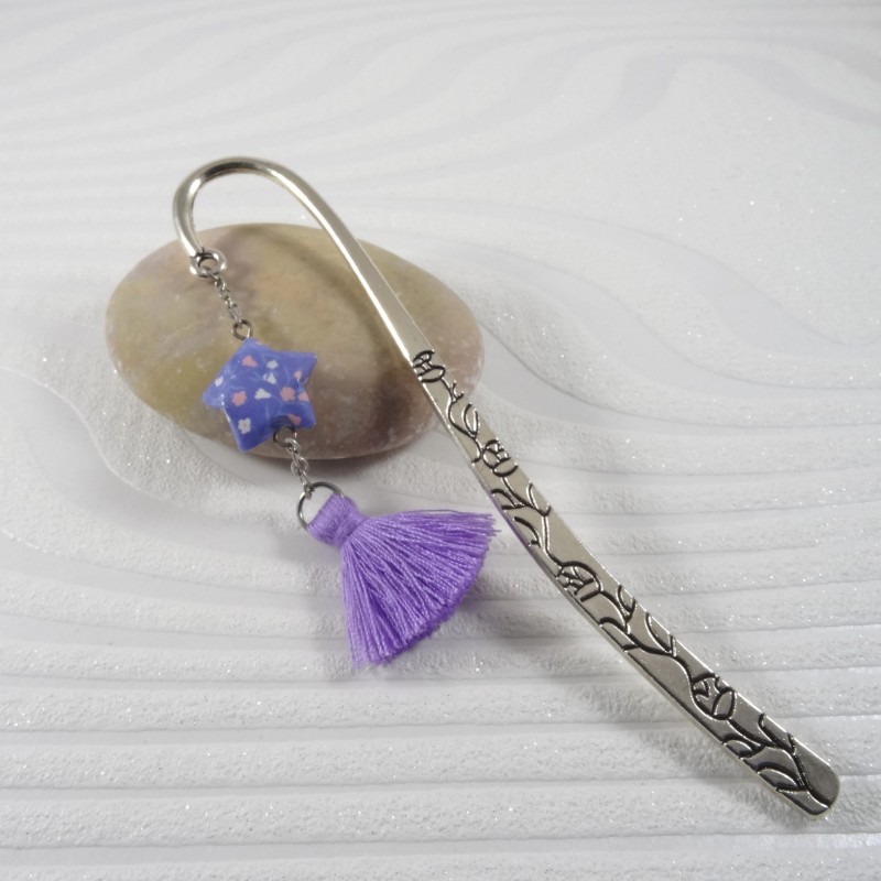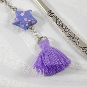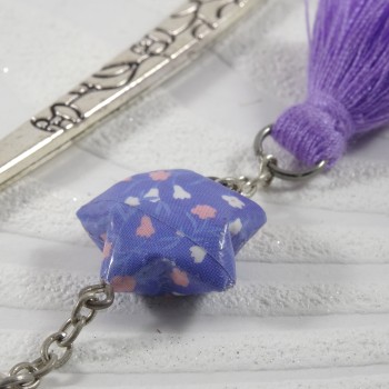 L'étoile est constituée d'un papier plié avec minutie à plusieurs reprises. Le papier utilisé est imprimé de fleurs rose et blanches sur un fond violet. La petite étoile a été vernie pour lui apporter robustesse et brillance. Le pompon, parme, finalise ce signet original.