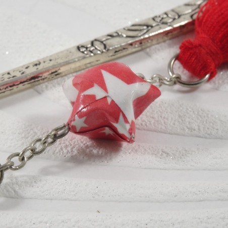 L'étoile est constituée d'un papier plié avec minutie à plusieurs reprises. Le papier utilisé est imprimé d'étoiles blanches sur un fond rouge. La petite étoile a été vernie pour lui apporter robustesse et brillance. Le pompon, rouge rouille, finalise ce signet original.
