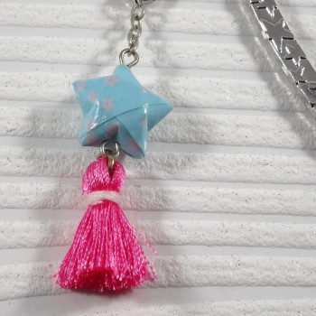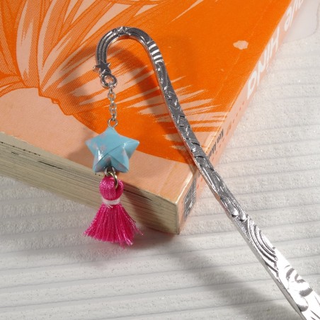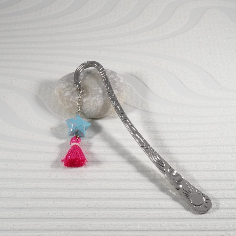 Ce marque-page Origami associe une étoile bicolore bleu et rose à un pompon fuchsia lumineux.