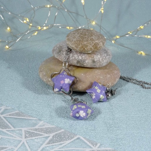 Cette parure Étoiles Origami est pliée à la main dans un papier parme délicat, orné de trèfles roses, blancs et jaunes pâles.