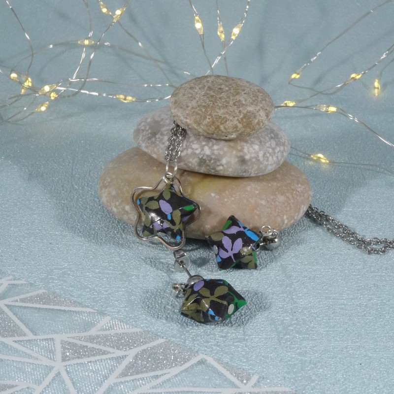 Cette parure Étoiles Origami est pliée à la main dans un papier noir profond, décoré de feuilles vertes, parmes et bleues.
